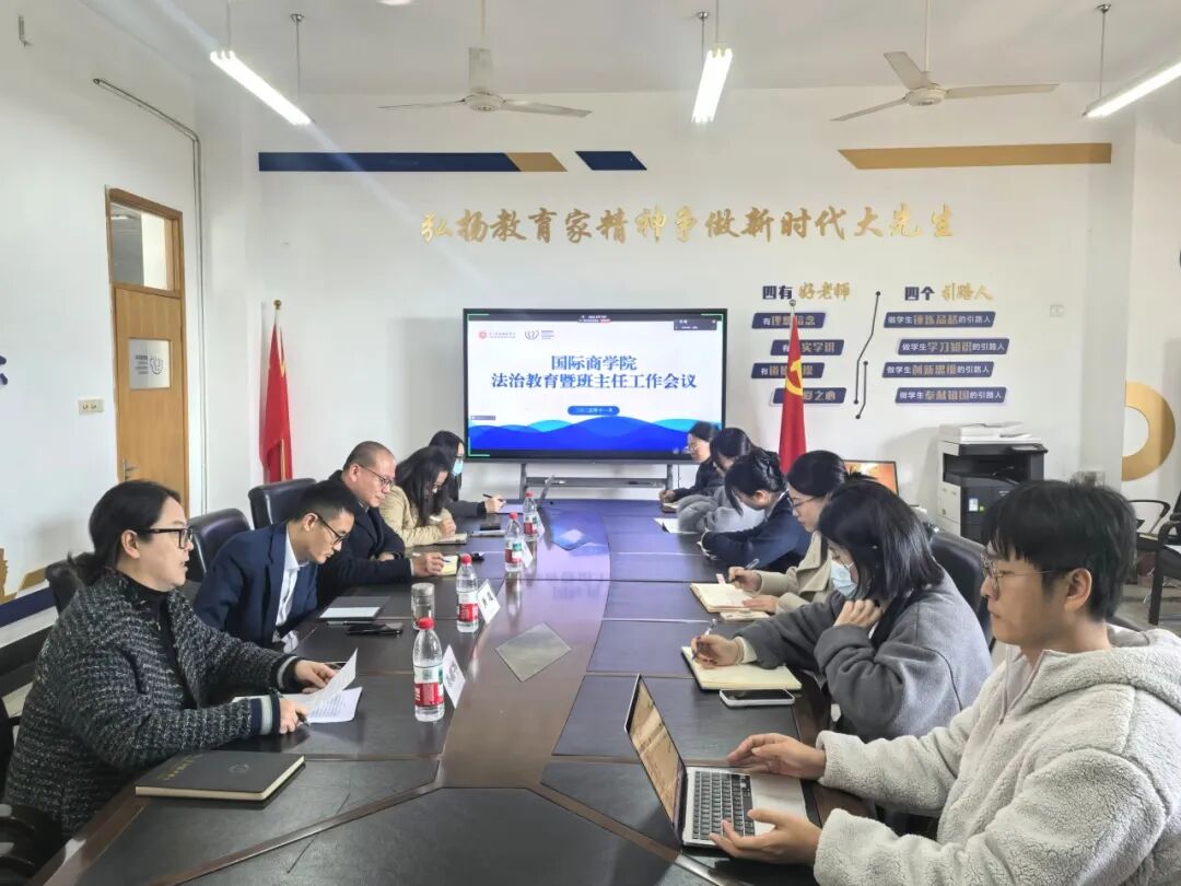 为加强大学生安全法治教育工作,夯实立德树人根基,11月26日,国际商学院在光大教学楼9429会议室召开法治教育暨班主任工作会议。学院党总支书记洪伟、副院长肖旭、副院长华红娟、党总支副书记蔡颖华出席会议,全体班主任及辅导员参加会议。